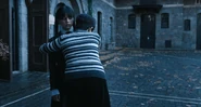 The next day, Wednesday quickly makes enemies, fencing with Bianca and then narrowly avoiding her own death when Xavier tackles her out of the way of a falling gargoyle. In the course of these events, she talks with fellow outcast Rowan, later revealed to have telekinetic abilities, and Xavier, whom she happens to know from when they were ten, as he almost got cremated by hiding in his godmother's coffin. Later, Wednesday finds Thing hiding under her covers and makes the hand pledge his loyalty to her.
